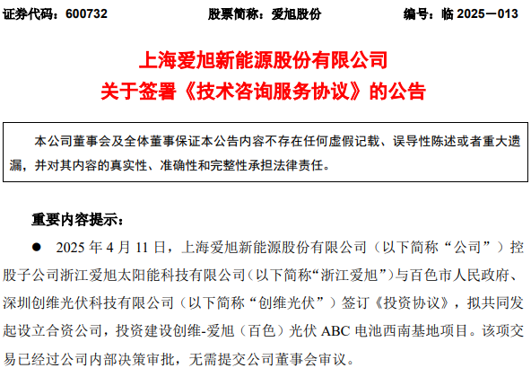 4月12日,爱旭股份发布公告称,控股子公司浙江爱旭太阳能科技有限公司(以下简称“浙江爱旭”)与广西百色市人民政府、深圳创维光伏科技有限公司(以下简称“创维光伏”)签订《投资协议》,拟共同发起设立合资公司,投资建设创维-爱旭(百色)光伏ABC电池西南基地项目。